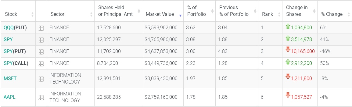 在前五大重仓股中,纳指100ETF看跌期权(QQQ.US,PUT)位列第一,持仓1752.86万股,持仓市值55.94亿美元,较上季度持仓数量增长了6%,占投资组合比例为3.62%。标普500指数ETF(SPY.US)位列第二,持仓1202.53万股,持仓市值约47.66亿美元,较上一季度增长41%,占投资组合比例为3.08%。第三和第四位分别为标普500指数ETF看跌、看涨期权,持仓市值分别为46.38亿美元和34.50亿美元;第五和第六位分别为微软(MSFT.US)和苹果(AAPL.US),持仓市值分别为30.39亿美元和27.59亿美元。