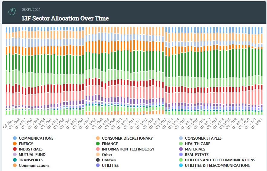 从持仓偏好来看,金融类、IT、及可选消费标的占摩根大通仓位重头,于2021Q1分别占比30.67%,17.00%,11.22%。