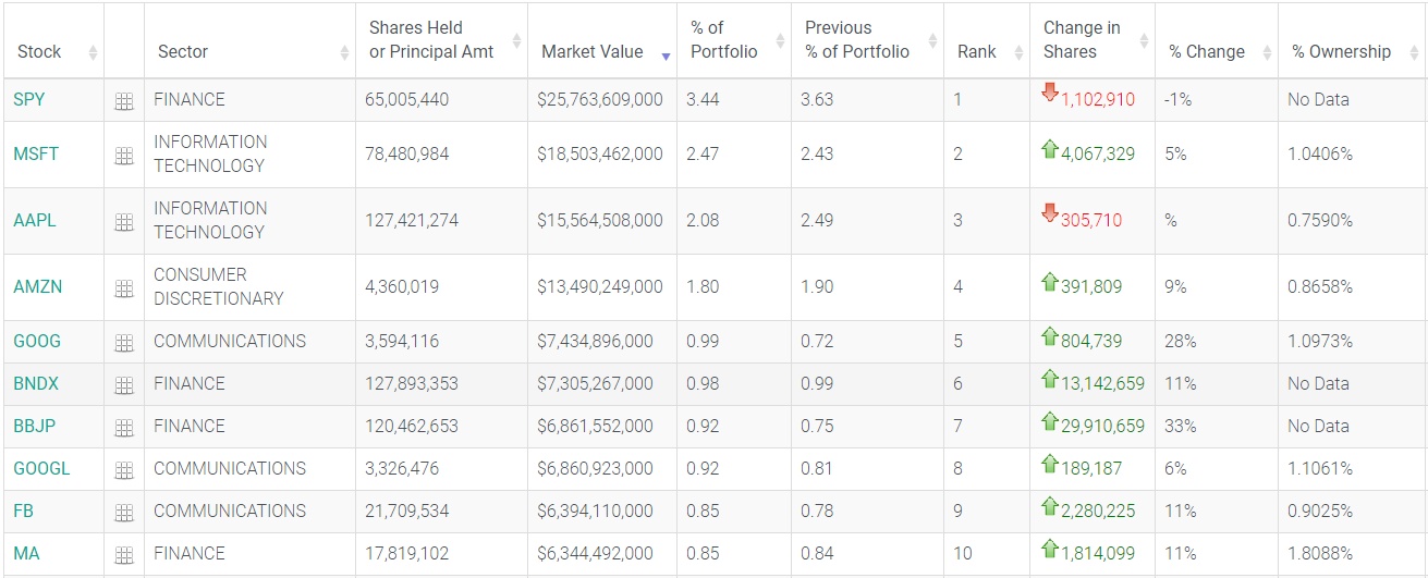 在前五大重仓股中,标普500指数ETF位列第一,持仓65,005,440股,持仓市值25,763,609,000美元,较上季度持仓数量减少1%,占投资组合比例为3.44%。微软(MSFT.US)上升至第二名,持仓65,005,440股,持仓市值18,503,462,000美元,占投资组合比例为2.47%。苹果(AAPL.US)位列第三,持仓127,421,274股,持仓市值15,564,508,000美元,占投资组合比例为2.08%。谷歌(GOOG.US)上升至第五名。