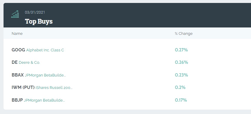 从持仓比例变化来看,前五大买入标的分别是:谷歌(GOOG.US)、迪尔公司(DE.US)、摩根大通BetaBuilders开发亚洲ex-JapanETF(BBAX.US)、罗素2000指数ETF看跌期权(IWM.US,PUT)、摩根大通BetaBuilders日本ETF(BBJP.US)。