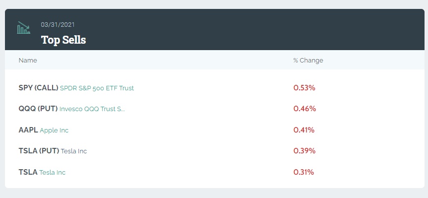 前五大卖出标的分别是:标普500指数ETF看涨期权(SPY.US,CALL)、纳指100ETF看跌期权(QQQ.US,PUT)、苹果(AAPL.US)、特斯拉看跌期权(TSLA.US,PUT)、特斯拉(TSLA.US)。