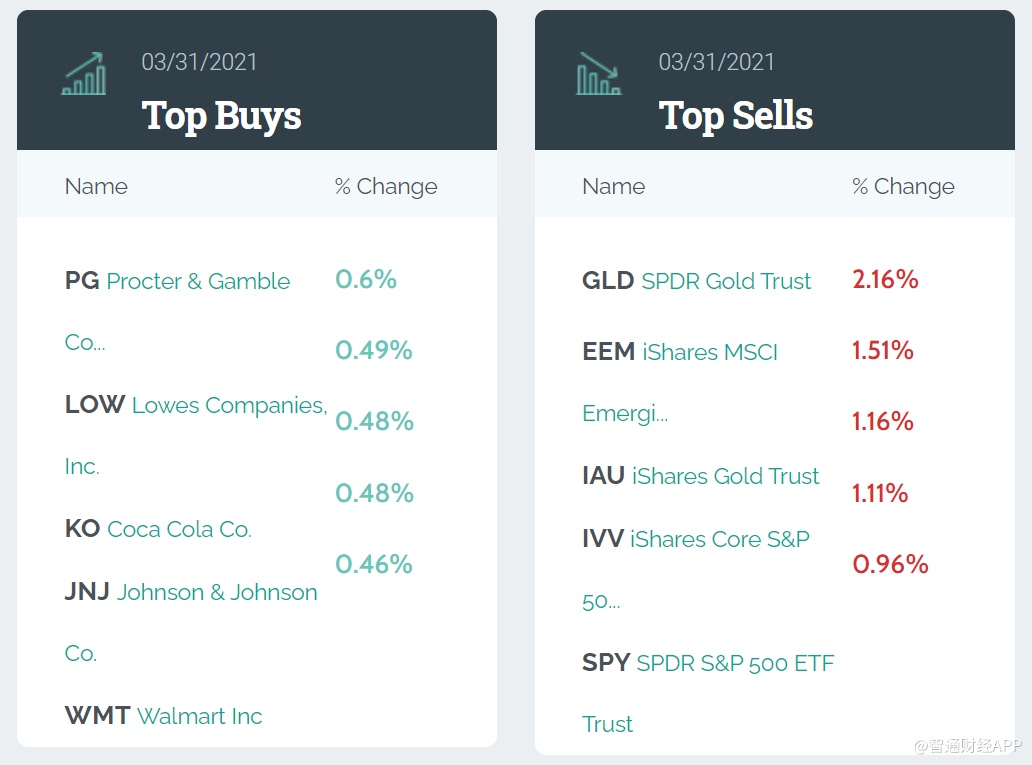 五大卖出股为黄金ETF-SPDR(GLD.US)、iShares新兴市场ETF(EEM.US)、iShares黄金信托(IAU.US)、iShares标普500指数ETF(IVV.US)及标普500指数ETF(SPY.US)。