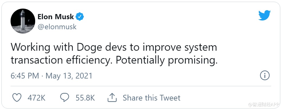 智通财经APP获悉,周五,狗狗币再一次受到马斯克推文的提振,盘中飙升至超过56美分的高点。马斯克在推特上写道,他正在与狗狗币的开发者合作,使交易更有效率。此前马斯克曾表示特斯拉(TSLA.US)因环境原因将停止接受比特币付款,导致加密货币大跌。