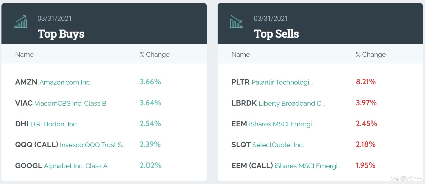 五大卖出股为Palantir(PLTR.US)、Liberty Broadband Corp (LBRDK.US)、iShares新兴市场ETF(EEM.US)及其看涨期权、SelectQuote Inc(SLQT.US)。