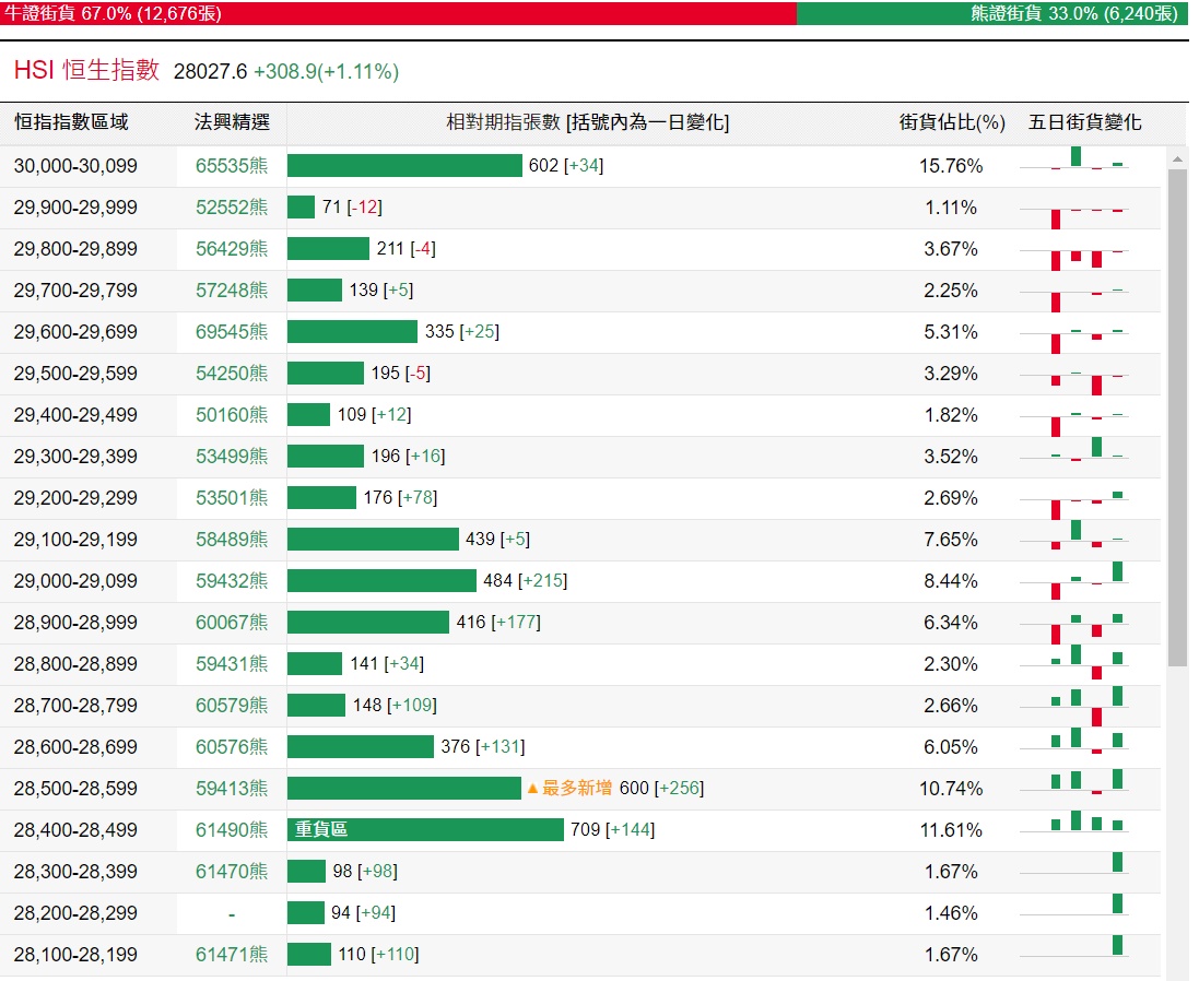 法兴恒指牛熊证街货分布图中的数据显示,熊证街货重货区在28,400-28,499区间,该区间最新熊证数量为709张,较上一交易日增加144张;最多新增在28,500-28,599区间,该区间最新熊证数量为600张,较上一交易日增加256张。