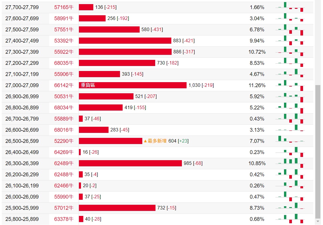 牛证街货重货区在27,000-27,099区间,该区间最新牛证数量为1030张,较上一交易日减少219张;最多新增在26,500-26,599区间,该区间最新牛证数量为604张,较上一交易日增加23张。