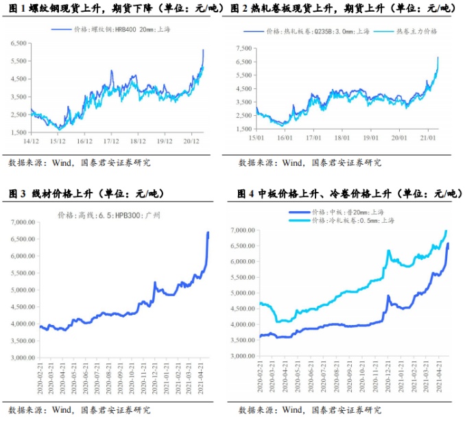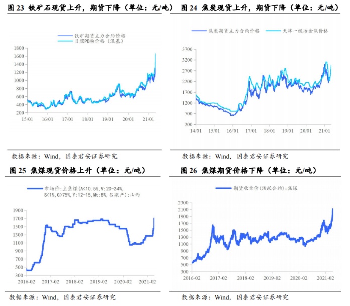 上周铁矿石现货价格上升,期货价格下跌。焦炭现货上升,期货下跌。上周日照港PB粉(铁含量61.5%)涨273元/吨至1658.0元/吨,涨幅19.71%;铁矿石主力期货价格跌53.5元/吨至1173.0元/吨,跌幅4.36%。焦炭方面,焦炭现货价格涨300元/吨至2950.0元/吨,涨幅11.32%;焦炭期货价格跌224元/吨至2614.5元/吨,跌幅7.89%。上周焦煤现货价格涨250元/吨至1700.0元/吨,涨幅17.24%;焦煤期货价格跌17.5元/吨至1922.0元/吨,跌幅0.90%。考虑到21年下半年淡水河谷的关停矿区陆续复产,铁矿供需缺口逐渐修复,维持21年铁矿石价格前高后低的判断。