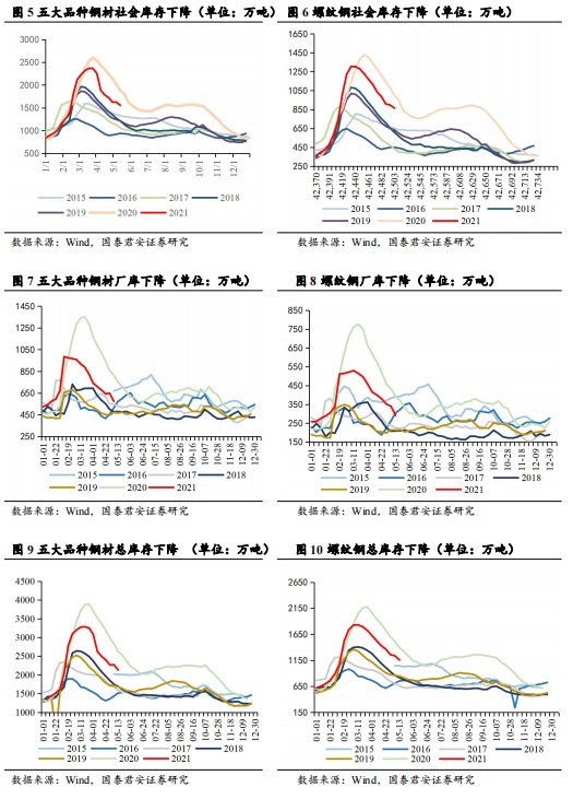 库存持续去化。上周钢材价格大幅波动,钢材下游整体需求依然偏强。上周五大品种社会、钢厂库存分别下降63.88、74.5万吨,库存在假期结束后恢复快速下降的趋势。上周热卷社会及钢厂库存分别下降5.73、6.9万吨,螺纹钢社会及钢厂库存分别下降32.11、49.33万吨,整体下游需求维持偏强。上周五大品种钢材表观消费1235.37万吨,较2015-2020年同期平均水平高178.53万吨。我们认为钢材需求将维持旺盛,库存持续去化,钢材价格维持强势。