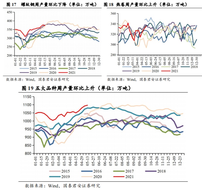 上周钢材产量上升。上周钢材周度总产量1096.99万吨,环比上升4.87万吨。其中螺纹钢产量371.56万吨,环比下降5.37万吨,产量较2016-2020年平均水平高32.024万吨。热卷产量335.64万吨,环比上升3.85万吨,较2016-2020年平均水平高11.772吨。