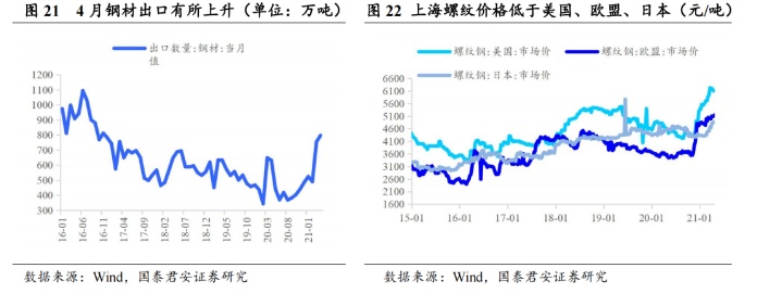 钢材出口持续放量。2021年3月我国钢材累计出口1768.2万吨,同比上升23.8%,增速较2月下降6.1个百分点;钢材累计进口371.8万吨,同比上升17%,增速较2月下降0.4个百分点,累计净出口钢材1768.2万吨。