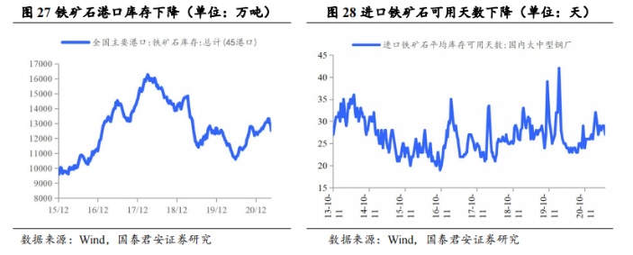 上周铁矿石港口库存减少,钢厂铁矿石可用天数下降。上周铁矿石港口库存12532.9万吨,下跌424.88万吨。上周钢厂铁矿石可用天数27天,较前一周下降2天。上周钢厂废钢可用库存11.6天,与前一周持平。