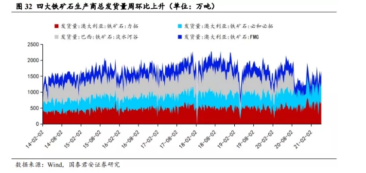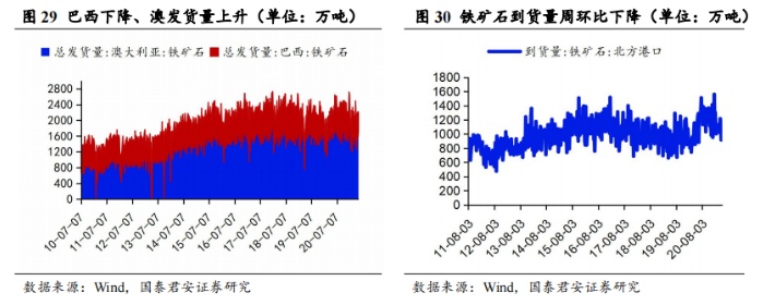 上周巴西铁矿石总发货量下降,澳大利亚铁矿石总发货量上升。上周巴西铁矿石总发货量474.4万吨,周环比下降175万吨;澳大利亚铁矿石总发货量1718.6万吨,周环比上升146.5万吨。