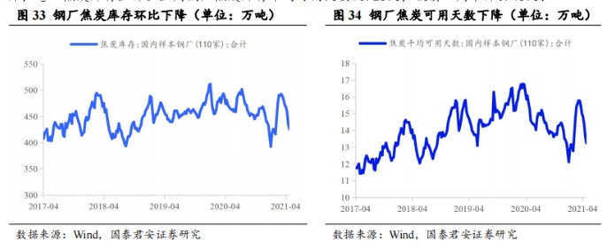 上周钢厂焦炭库存下降,钢厂焦炭平均可用天数下降。上周钢厂焦炭库存下降,焦化厂焦炭库存下降,港口焦炭库存上升。上周钢厂焦炭库存平均可用天数13.25天,较前一周下降0.48天;