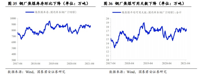 上周钢厂焦煤库存下降,钢厂焦煤平均可用天数下降。上周焦煤钢厂库存环比下降,独立焦化厂焦煤库存下降,三港口焦煤库存上升,六港口焦煤库存上升。上周钢厂焦煤库存平均可用天数17.06天,较前一周下降0.39天。
