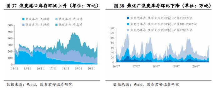 上周焦化厂焦炭库存下降,港口焦炭库存上升。100家焦化企业焦炭总库存27.97万吨,环比减少0.83万吨;北方四港口焦炭库存总计362.5万吨,周环比上升95.5万吨。