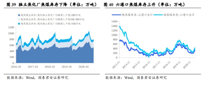 上周独立焦化厂焦煤库存下降,三港口焦煤库存上升,六港口焦煤库存上升。100家独立焦化厂焦煤库存778.96万吨,环比下降17.99万吨。上周三港口(京唐、日照、连云港)焦煤库存362万吨,周环比上升5万吨。六港口(三港口和青岛、日照、连云港)焦煤库存432万吨,较前一周上升1万吨。