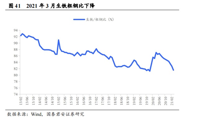 2021年3月生铁粗钢比为79.50%,环比下降1.83个百分点。即粗钢产量中20.5%是废钢。国内高炉受限较多,高炉产量的下降带来行业利润的上升,电炉性价比逐渐上升,生铁粗钢比稳步下降。预期下半年随着铁矿价格回落,铁水粗钢比有望逐步回升。