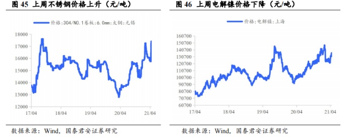 上周不锈钢价格上升,电解镍价格下降。上周不锈钢(304,6mm卷板)价格涨1650元/吨至17400元/吨,涨幅10.48%;电解镍跌3200元/吨至131010元/吨,跌幅2.38%。
