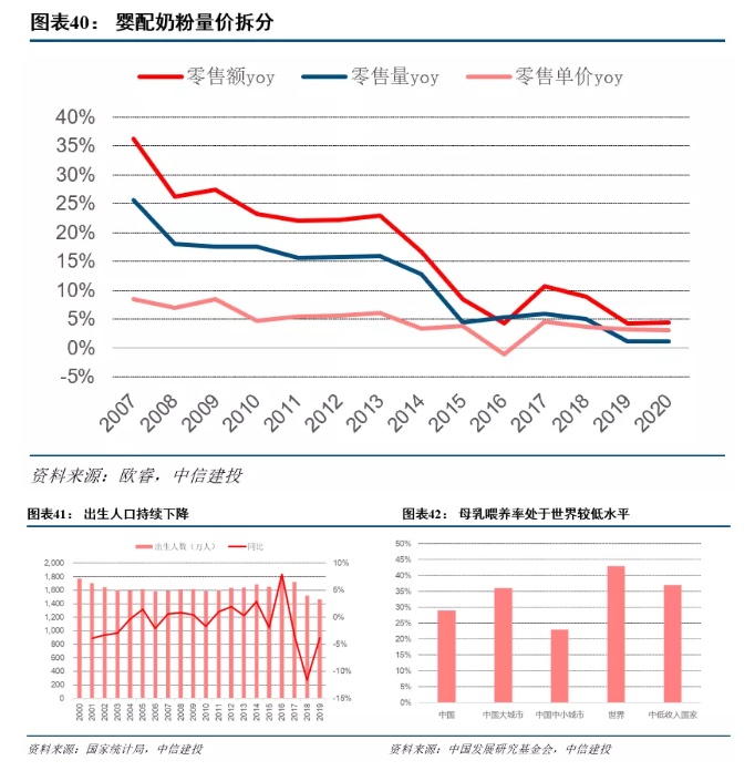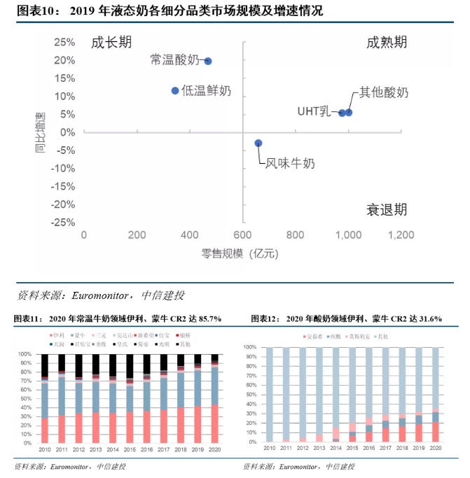 常温牛奶、常温酸奶分别处于成熟期、成长期,市场规模扩大主要依赖于产品高端化带来的提价。常温牛奶中,2020年伊利、蒙牛(02319)两大集团CR2达到85.7%。未来市场规模提升主要来自产品高端化升级。常温牛奶主要通过品牌区分档次,从而实现价格带的提升。同一品牌内,企业再通过营养成分和包装形态提升价格。在常温酸奶中,2019年常温酸奶安慕希、纯甄、莫斯利安三家CR3达到91%。常温酸奶渗透率和高端化仍有较大提升空间。