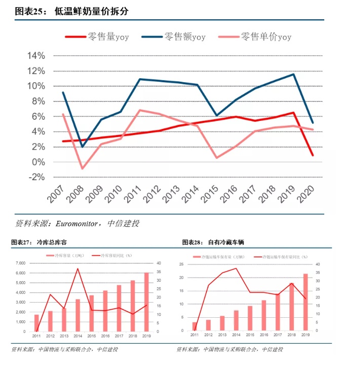 低温板块主要由低温鲜奶和低温酸奶构成,分别处于成长期、成熟期。低温鲜奶2015年零售规模增速超过常温牛奶,疫情影响之下需求迎来快速增长。我国冷链基础设施发展快速,二三线城市冷库新增明显,随着冷链基础设施持续推进,乳企可快速提升冷链物流能力。低温酸奶作为代餐、甜品的非功能性诉求也在快速上升,2016年主打特色酸奶饮品的一只酸奶牛诞生,1年时间内开店200家,为低温酸奶的提振带来更多可能。光明、新乳业凭借自有牧场和冷链渠道优势,有望受益于低温鲜奶板块的整体崛起,蒙牛、伊利在发展低温酸奶时已具备丰富的低温运营经验,未来推出保质期较长的ESL乳有望复制低温酸奶的成功。