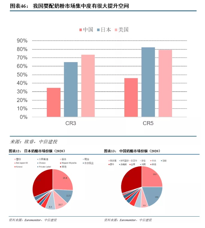 (1)虽然婴配奶粉进入成熟期,并且受出生率持续走低影响,婴配奶粉消费量增长趋于温和,但高端化成为推动奶粉市场规模增长的有力因素。对比美日,婴配奶粉市场集中度有望进一步提高,国产龙头品牌在政策助力和渠道发力下,有望加速集中份额。(2)奶酪产业符合消费升级规律,是乳制品行业内具有高增长、高天花板的优质赛道,目前中国奶酪市场中大部分为外资品牌,国货存在崛起空间。