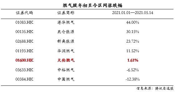 2021年天伦燃气对公司的业绩指引更加乐观,零售气量有望增长25%,核心净利增长15%,而核心净利每股派息则不低于30%。目前,天伦燃气2021年业绩指引所反映的企业增长领先同业,但股价增幅仍逊于行业平均水平,多家大行表示“天伦燃气现在的估值非常具有吸引力”。