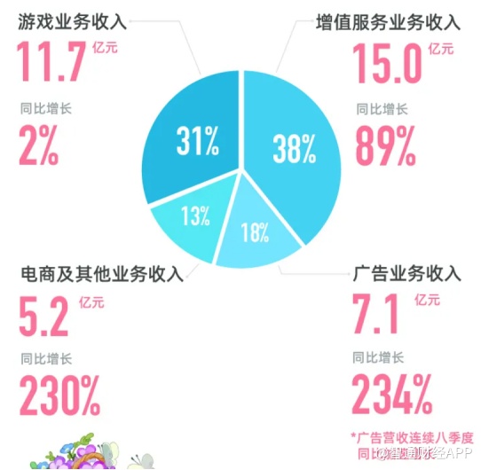 关键财务数据增长的背后,四大业务稳定高速增长不容忽视。游戏业务、增值服务业务、广告业务和电子商务及其他业务组成B站营收结构的核心要素。本季度,四大业务收入分别为11.7亿元、15.0亿元、7.2亿元和5.2亿元,同比增长2%、89%、234%和230%。