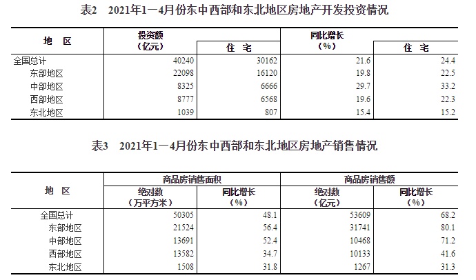 1—4月份,东部地区商品房销售面积21524万平方米,同比增长56.4%;销售额31741亿元,增长80.1%。中部地区商品房销售面积13691万平方米,增长52.4%;销售额10468亿元,增长71.2%。西部地区商品房销售面积13582万平方米,增长34.7%;销售额10133亿元,增长41.6%。东北地区商品房销售面积1508万平方米,增长31.8%;销售额1267亿元,增长31.3%。