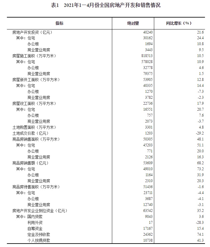 1—4月份,商品房销售面积50305万平方米,同比增长48.1%;比2019年1—4月份增长19.5%,两年平均增长9.3%。其中,住宅销售面积增长51.1%,办公楼销售面积增长20.0%,商业营业用房销售面积增长16.3%。商品房销售额53609亿元,增长68.2%;比2019年1—4月份增长37.0%,两年平均增长17.0%。其中,住宅销售额增长73.2%,办公楼销售额增长31.9%,商业营业用房销售额增长20.3%。