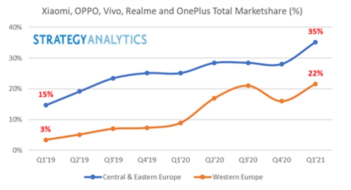 智通财经APP获悉,根据市场研究机构Strategy Analytics最新发表的报告显示,在华为战略性撤退的背景下,一批新的中国智能手机厂商正在征服欧洲。从2019年Q1到2021年Q1,小米(01810)、OPPO、vivo、Realme和一加在欧洲的出货量在两年内几乎翻了两番。