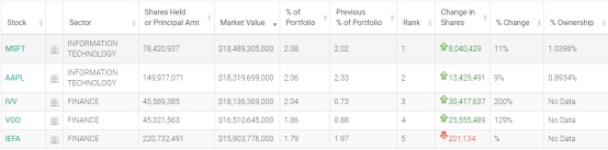 在前五大重仓股中,微软(MSFT.US)位列第一,持仓约7842.09万股,持仓市值为184.89亿美元,较上季度持仓数量增加了11%,占投资组合比例为2.08%。
