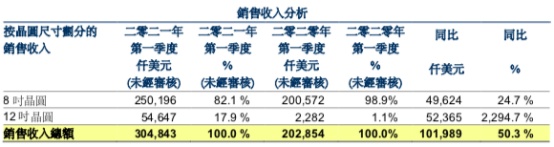 以收入贡献来看,华虹半导体超过95%的收入来源于半导体晶圆的直接销售。其中,晶圆又可以划分为8寸晶圆和12寸晶圆。具体来看,报告期内8寸晶圆实现收入2.5亿美元,占比82.1%,规模同比上升24.7%;12寸晶圆实现收入5464.7万美元,占比17.9%,规模增速高达2294.7%。不难看出,12寸晶圆的强劲增长,是华虹半导体一季度业绩爆发的最大增量。