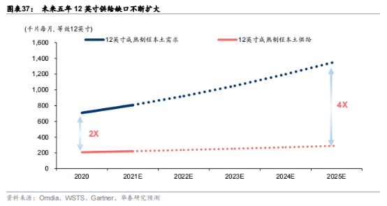 相比之下,12寸晶圆的未来形势或许更为乐观。根据华泰证券研报显示,过去几年半导体国产化需求呈现明显加快趋势,国内芯片设计公司有望在未来5年内保持快速增长,整体芯片自给率有望从2020年的18%提升至2025年的30%。而在此背景下,2025年国内本土芯片设计公司对12寸成熟制程晶圆代工的需求有望翻倍;假设这期间国内晶圆代工厂产能没有额外的扩张计划,那么2025年供给缺口或扩大到四倍。