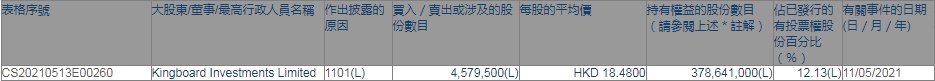 智通财经APP获悉,香港联交所最新资料显示,5月11日,Kingboard Investments Limited增持建滔积层板(01888)457.95万股,每股作价18.48港元,总金额约为8462.92万港元。增持后最新持股数目约为3.79亿股,最新持股比例为12.13%。