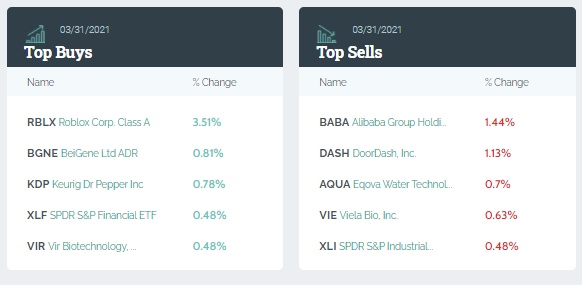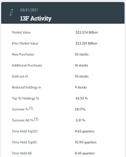 前五大卖出标的分别是:阿里巴巴(BABA.US)、DoorDash(DASH.US)、Evoqua Water Technologies Corp(AQUA.US)、Viela Bio, Inc(VIE.US)、SPDR S&P Industrial ETF。