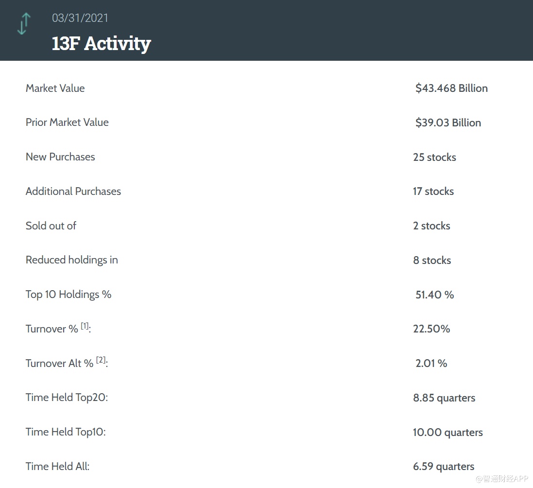 据统计,老虎环球基金一季度持仓总市值达434.68亿美元,上一季度总市值为390.3亿美元。老虎环球基金在一季度的持仓组合中新建仓了25只个股,增持了17只个股。同时,老虎环球基金还减持了8只个股,仅清仓了2只个股。其中前十大持仓标的占总市值的51.4%。