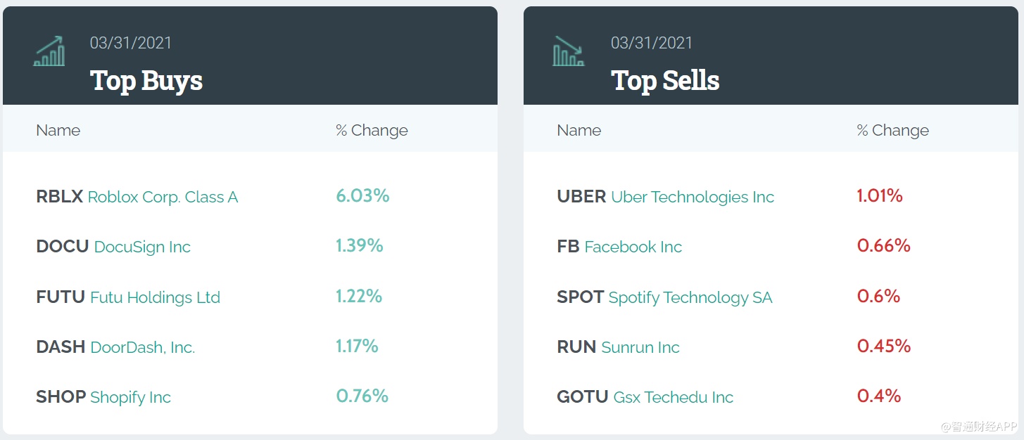 该基金第一季度前五大买入股为:Roblox Corp(RBLX.US)、DocuSign Inc(DOCU.US)、富途控股(FUTU.US)、DoorDash(DASH.US)及Shopify Inc(SHOP.US),其中富途控股为新建仓位。该基金还增持了Zoom(ZM.US)及SEA(SE.US)等。