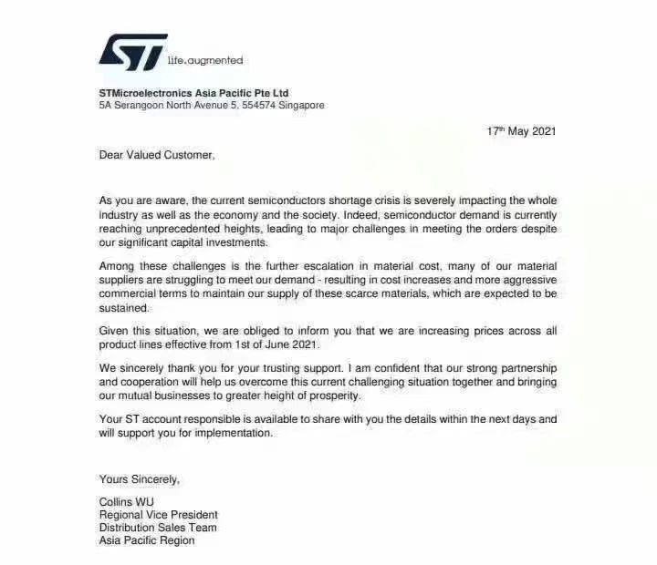 其中,原材料供应成本增加。鉴于这种情况,意法半导体将从2021年6月1日起提高所有产品线的价格。