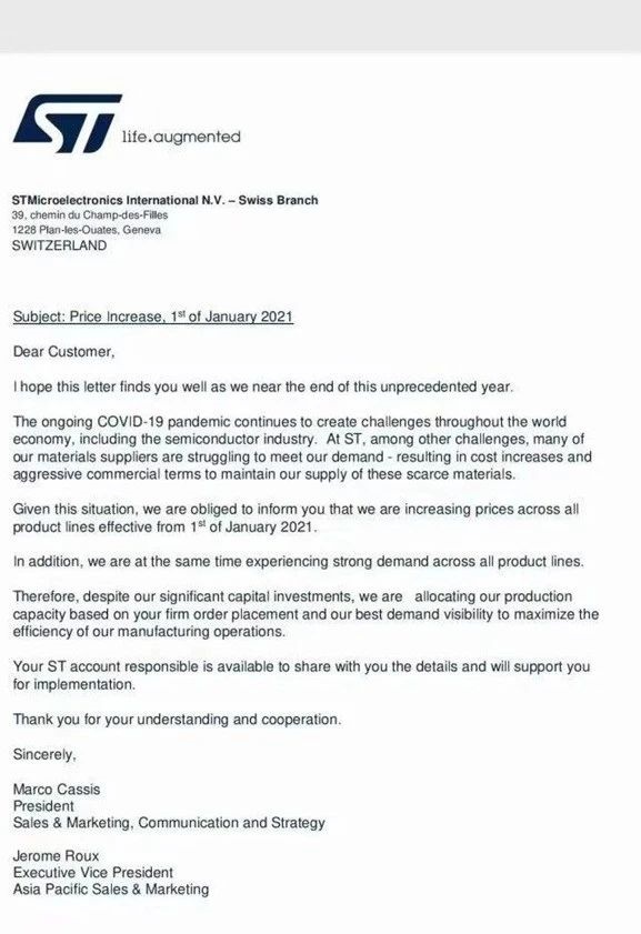 2020年12月,意法半导体曾发布涨价函。涨价函中表示,受全球新冠疫情大流行的影响,意法半导体所需的很多原材料供应紧张,而供应商为了维持对于意法半导体的供应,导致了成本的上升和激进的商业条款,因此,意法半导体决定自2020年1月1日起,提高所有产品线的价格。