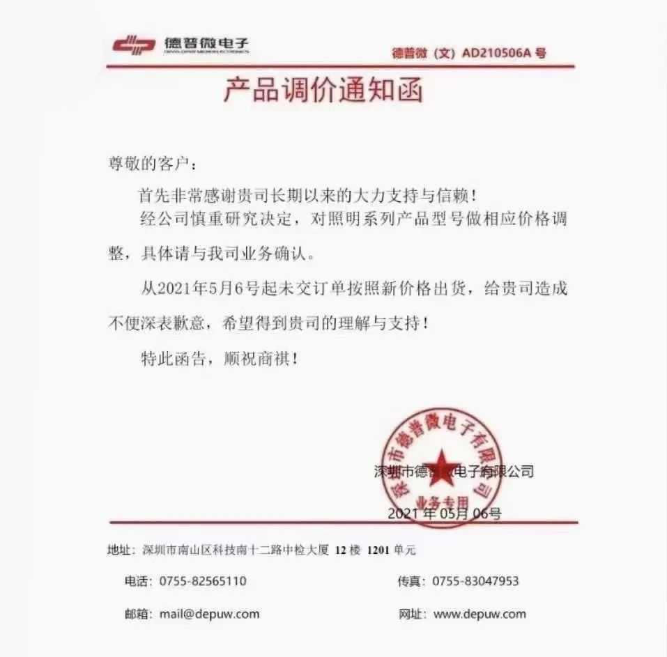 深圳市德普微电子有限公司宣布,5月6日起对照明系列产品型号做相应价格调整,未交订单按照最新价格出货。