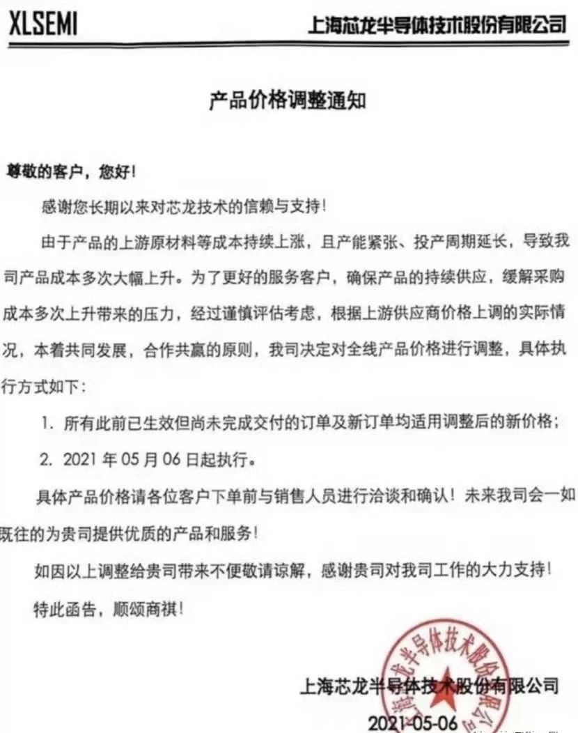 5月6日,上海芯龙半导体技术股份有限公司发布产品价格调整通知称,由于产品的上游原材料等成本持续上涨,且产能紧张、投产周期延长,导致我司产品成本多次大幅上升。为了更好的服务客户,确保产品的持续供应,缓解采购成本多次上升带来的压力,经过谨慎评估考虑,根据上游供应商价格上调的实际情况,本着共同发展,合作共赢的原则,决定对全线产品价格进行调整。具体执行方式如下: