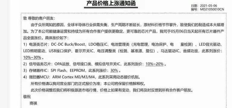 近日,富鸿创芯发布产品价格上涨通知函称,由于众所周知的原因,全球半导体行业供需失衡,生产周期不断延长,原材料价格节节攀升,致使公司的制造成本大幅增加。为了公司能健康运营和持续为所有合作客户提供更稳定、更可靠的芯片产品,公司将于5月6日当天起所有芯片器件产品全面涨价。