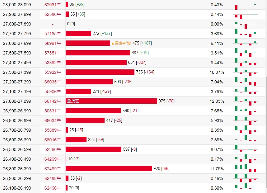 牛证街货重货区在27000-27099区间,该区间最新牛证数量为975张,较上一交易日减少70张;最多新增在27600-27699区间,该区间最新牛证数量为475张,较上一交易日增加187张。