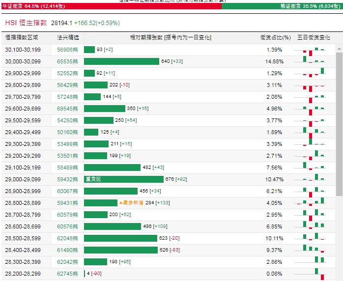 法兴恒指牛熊证街货分布图中的数据显示,熊证街货重货区在29000-29099区间,该区间最新熊正数量为676,较上一交易日增加了92张;最多新增在28800-28899区间,该区间最新熊证数量为284张,较上一交易日增加133张。