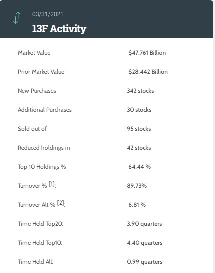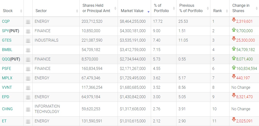 在前五大重仓股中,能源股Cheniere Energy(CQP.US)位列第一,持仓约2.04亿股,持仓市值约84.64亿美元。标普500指数ETF看跌期权(SPY.US.PUT)位列第二,持仓约1085万股,持仓市值约43亿美元。Gates Industrial(GTES.US)位列第三,持仓约2.21亿股,持仓市值约35.35亿美元。Bumble(BMBL.US)位列第四,持仓约5471万股,持仓市值约34.13亿美元。第五为纳指100ETF看跌期权(QQQ.US.PUT)持仓857万,持仓价值为27.35亿美元。