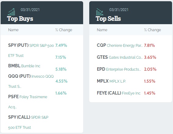 从持仓比例变化来看,前五大买入标的分别是:标普500指数ETF看跌期权(SPY.US.PUT)、BUMBLE(BMBL.US)、纳指100ETF看跌权(QQQ.US.PUT)、PAYSAFE(PSFE.US)、标普500指数ETF看涨期权(SPY.US.CALL)。