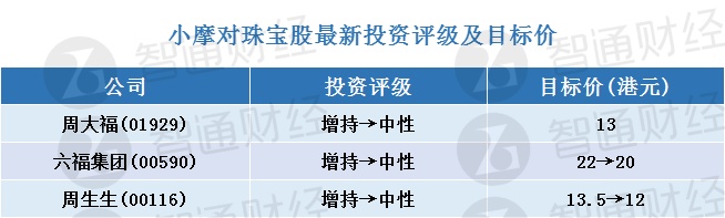 智通财经APP获悉,小摩发布研究报告称,受惠于稳固需求复苏,过去数季比较基数较低,以及店铺积极复业,该行覆盖的珠宝股年初至今累升25%,同期MSCI中国非必需消费品指数则跌15%。不过,由于增加店铺竞争趋于激烈,自7月起比较基数上升,将所覆盖的四家珠宝股评级由“增持”降至“中性”,包括周大福(01929)、六福集团(00590)、周生生(00116)及老凤祥(600612.SH)。