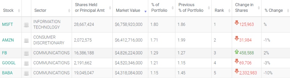 从持仓来看,在前五大重仓股中,微软(MSFT.US)位列第一,持仓约2866.7万股,持仓市值约67.59亿美元,占投资组合比例为1.80%。亚马逊(AMZN.US)位列第二,持仓约207.3万股,持仓市值约64.13亿美元,较上季度持仓数量下降了1%,占投资组合比例为1.71%。Facebook(FB.US)位列第三,持仓约1638.6万股,持仓市值48.26亿美元。谷歌(GOOGL.US)位列第四,持仓约219.2万股,持仓市值45.20亿美元。阿里巴巴(BABA.US)位列第五,持仓约1904.5万股,持仓市值约43.18亿美元,较上一季度下降10%。
