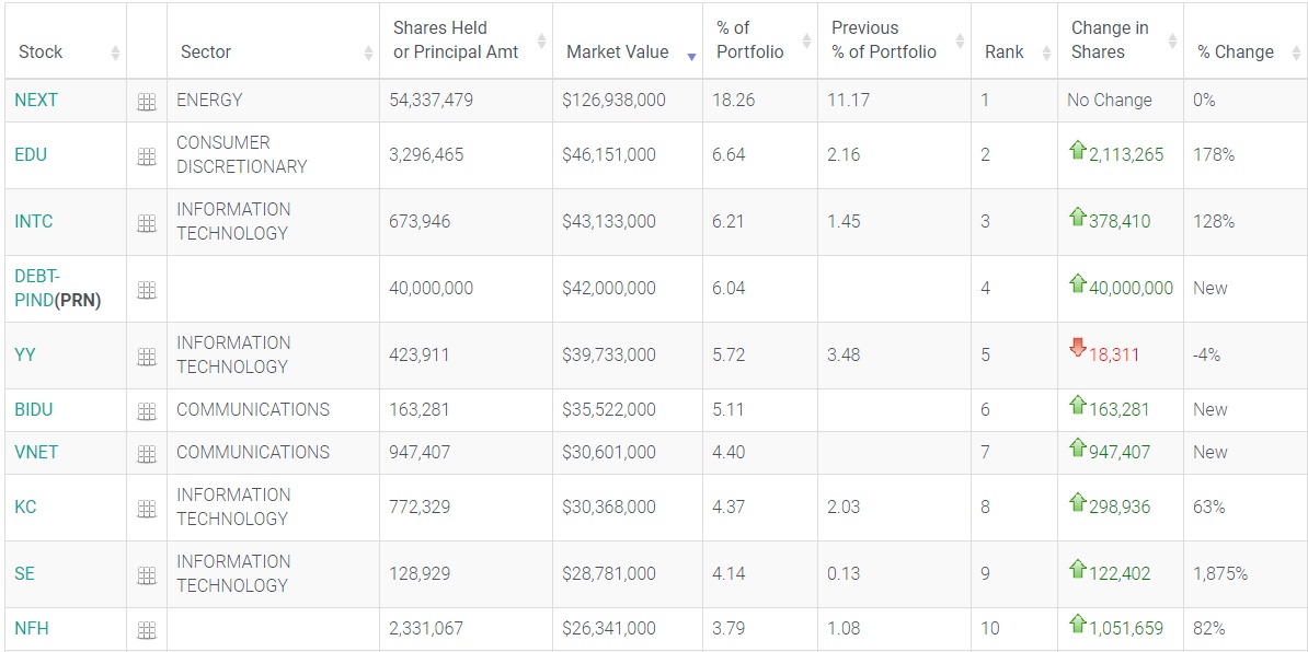 欢聚(YY.US)、百度ADR、世纪互联、金山云(KC.US)和新风医疗(NFH.US)分别位列重仓股第五、第六、第七、第八、第十位。