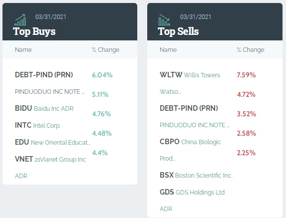 从持仓比例变化来看,前五大买入标包括百度ADR、英特尔、新东方和世纪互联。前五大卖出标的包括Willis Towers Watson PLC(WLTW.US)、泰邦生物(CBPO.US)、波士顿科学(BSX.US)和万国数据ADR。